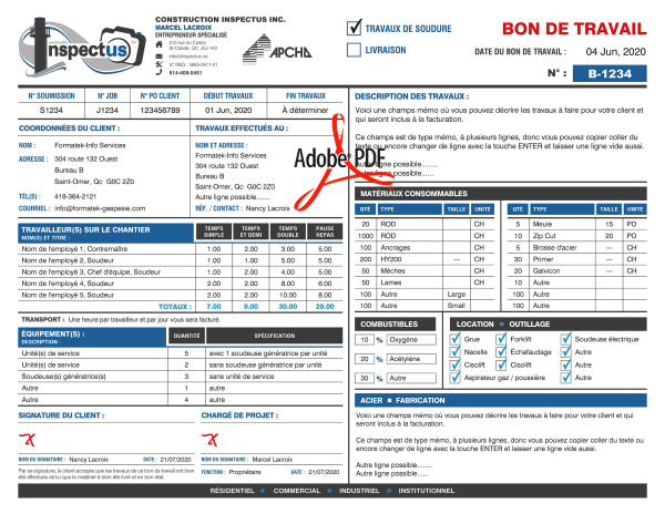 Particularité : Ce formulaire administratif sert à transmettre des informations l’interne au bon département de l’entreprise selon les activités à réaliser (donner un itinéraire à un camionneur, préparer/réserver un équipement avant sa location, etc. Le coût pour la programmation de ce type de formulaire PDF peut varier entre 175 $ à 275 $.