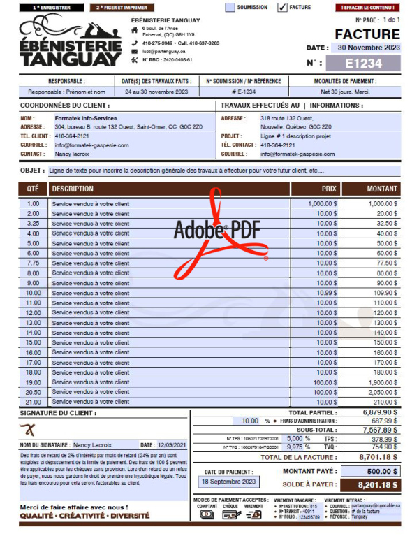 Particularité : Ce formulaire est un 2 en 1 où vous pouvez basculer de la soumission à la facture. Nous vous informerons de tous les détails particuliers à prendre en considération si vous désirez ce type de formulaire par bsculement suite à votre demande de devis par courriel.