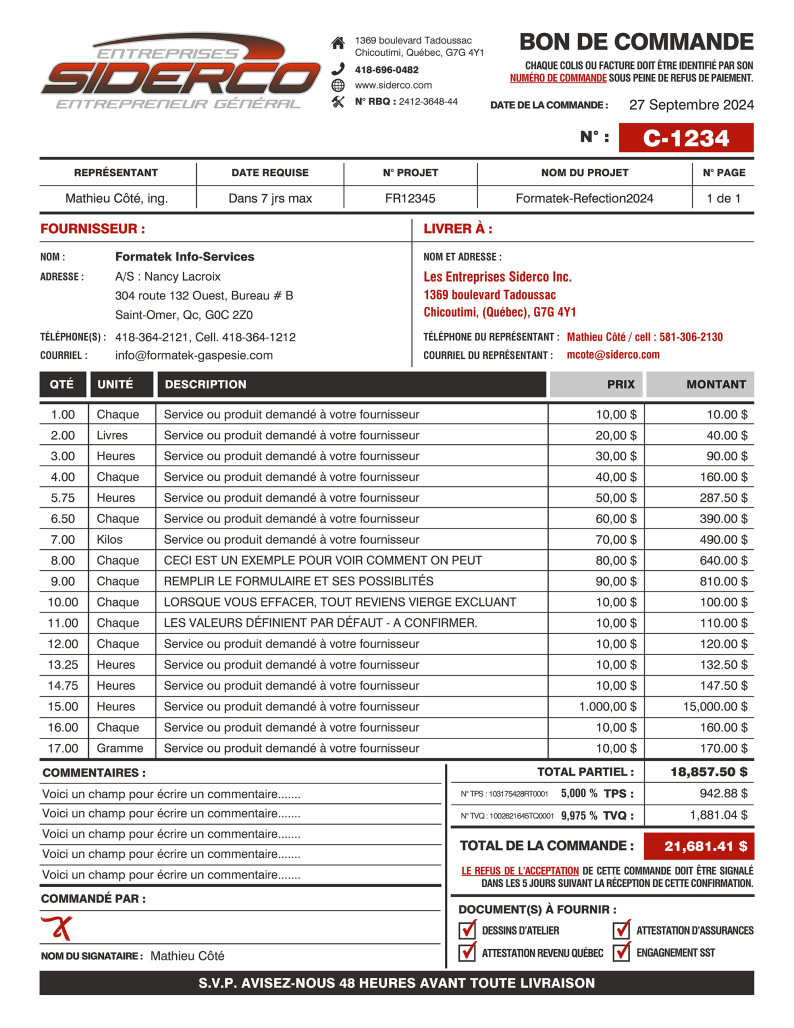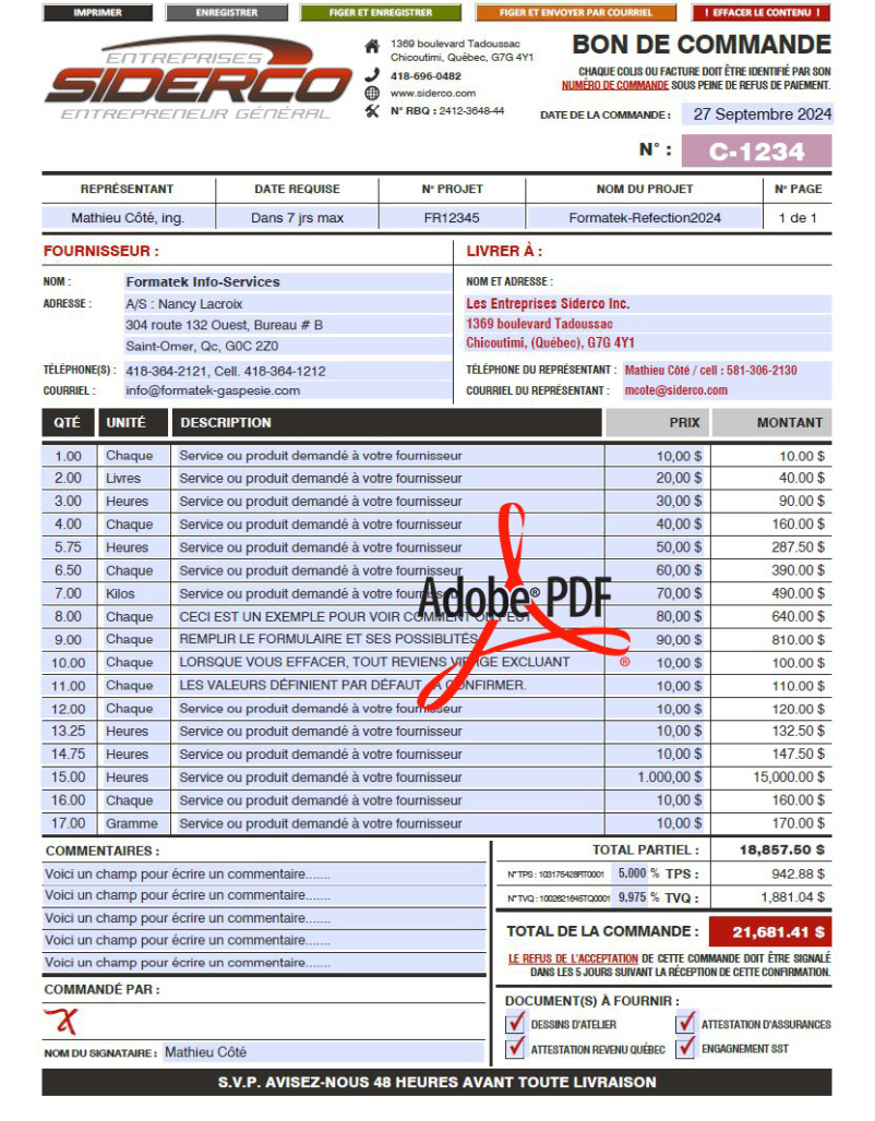 Particularité : Le prix de ce formulaire de commande pour fournisseur est plus élevé parce qu'il contient des cases à cocher, textes ajoutés et des champs supplémentaires à la demande du client.
