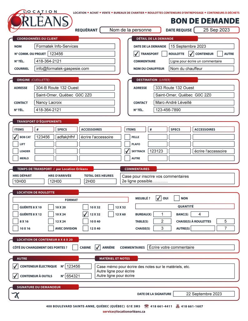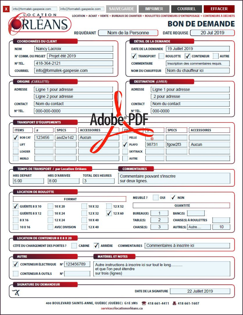 Particularité : Ce formulaire administratif sert à transmettre des informations l’interne au bon département de l’entreprise selon les activités à réaliser (donner un itinéraire à un camionneur, préparer/réserver un équipement avant sa location, etc. Le coût pour la programmation de ce type de formulaire PDF peut varier entre 175 $ à 275 $.