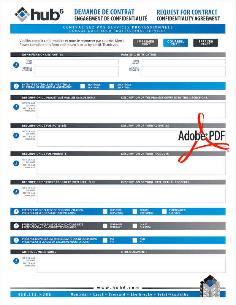Particularité : Ce formulaire administratif est envoyé à la clientèle pour être remplie et renvoyé à l’entreprise. Habituellement, sans programmation poussée, le coût pour la programmation de ce type de formulaire PDF peut varier entre 195 $ à 295 $.