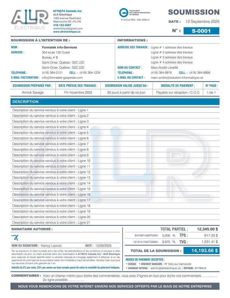 Particularité : Le prix de base ce formulaire de soumission est plus élevé parce qu'il contient des menus déroulants. Sans les menus, le prix de base est de 125.00 $