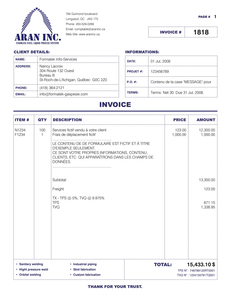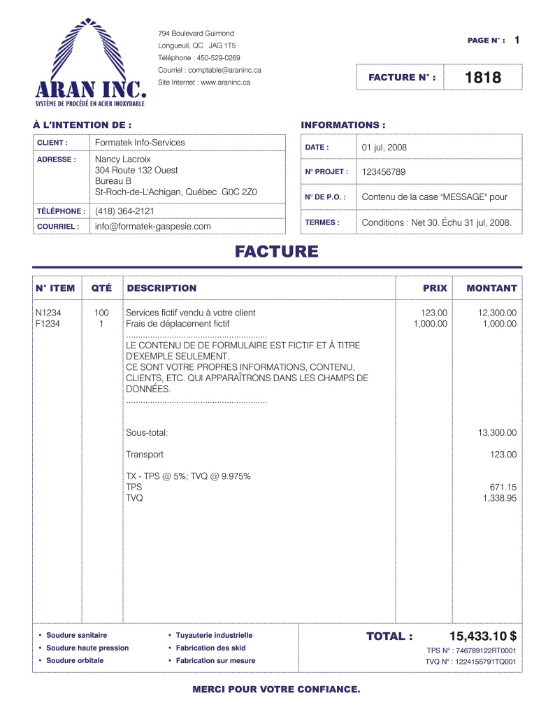 INSTALLATION : Pour la première commande, vous devez également prévoir un coût unique obligatoire de 40.00 $ pour l'installation à distance de 1 à 3 formulaires afin que la procédure vous soit expliquée pour une première fois (téléphone + connexion Internet). Ce prix sera inclus à la soumission de prix officielle qui vous sera envoyée par courriel.