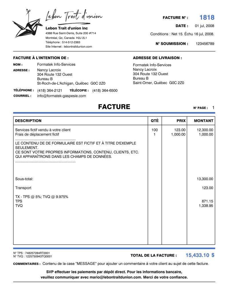 INSTALLATION : Pour la première commande, vous devez également prévoir un coût unique obligatoire de 40.00 $ pour l'installation à distance de 1 à 3 formulaires afin que la procédure vous soit expliquée pour une première fois (téléphone + connexion Internet). Ce prix sera inclus à la soumission de prix officielle qui vous sera envoyée par courriel.