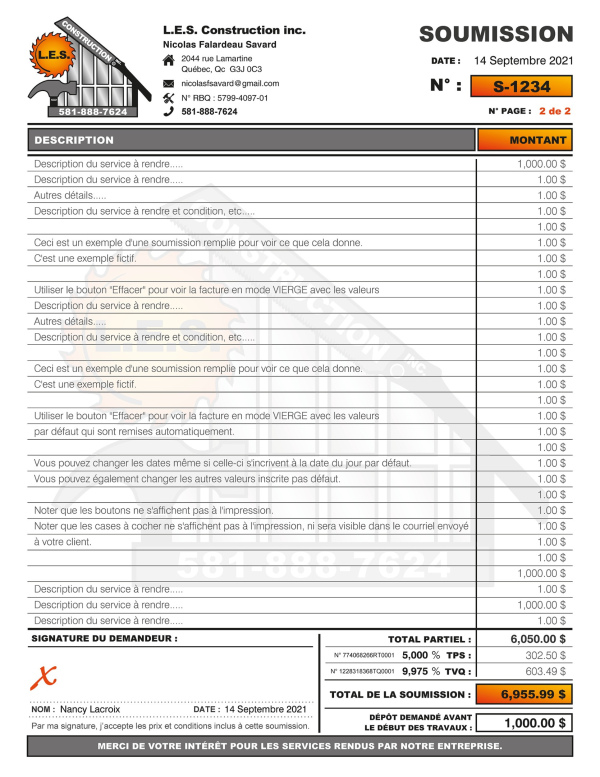 Toutes les instructions et ébauche(s) à approuver (exemple(s) à tester au format PDF dynamique et protégé(s) par filigrane avant paiement) vous seront envoyées par courriel au fur et à mesure suite à l’acceptation de notre soumission de prix et l'avancement des travaux de création et programmation.